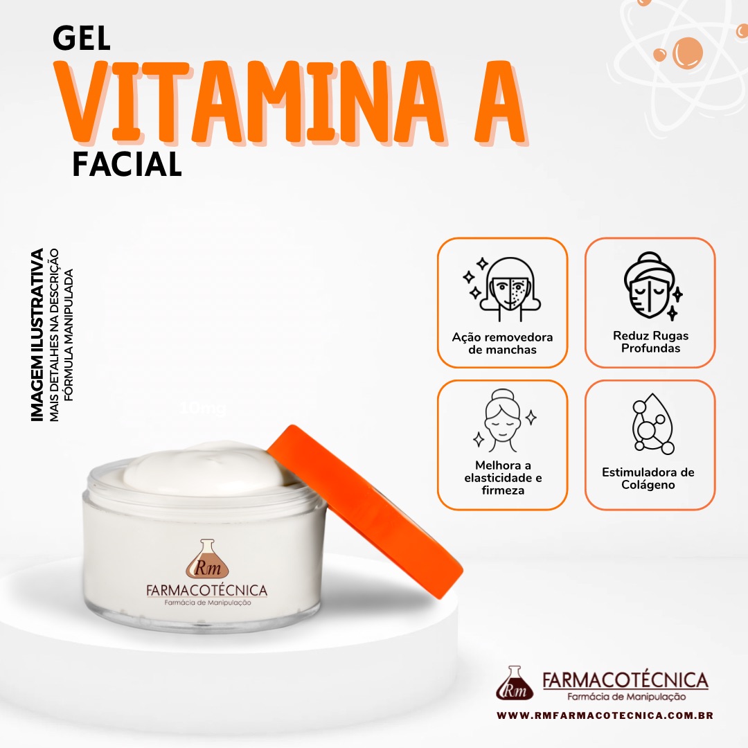 O Gel de Vit A (Retinol) é um creme facial anti-idade de uso noturno indicado para todos os tipos de pele, principalmente as maduras. Conhecido como o anti-aging mais indicado pois corrige rugas acentuadas enquanto clareia e uniformiza o tom e a textura da pele. Promove renovação celular profunda, estimulando a síntese de colágeno e melhorando a aparência da pele. Possui efeito antioxidante, prevenindo e clareando manchas e rugas causadas pelo sol e pela idade, além de peptídeos que promovem firmeza à pele.